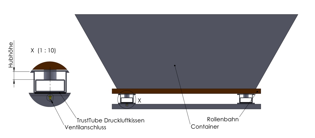 n the application example shown below, the TrustTube® compressed air cushion used to lift a container for reloading over a roller conveyor.