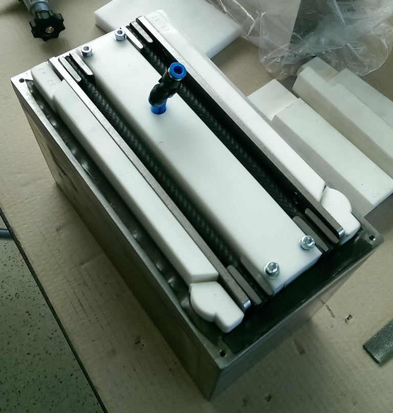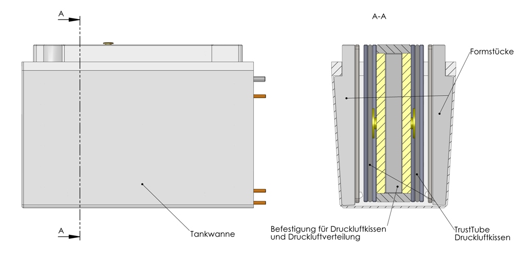 The coating is placed in the tank pan. The molded pieces and the compressed air cushions are then placed in the tank tray.